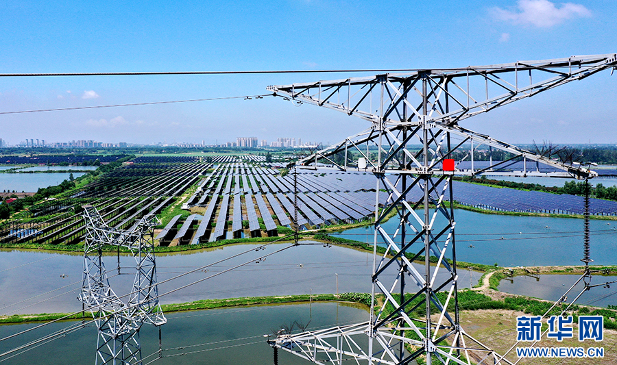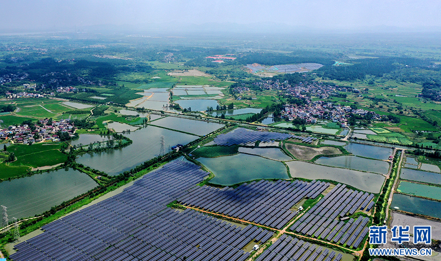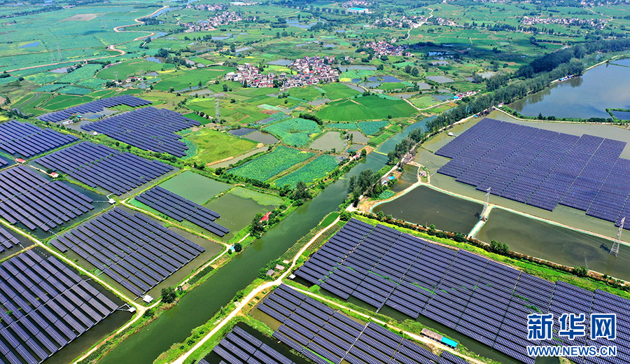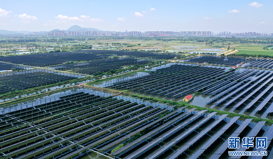 近年来,铜陵市义安区因地制宜、加快推进“渔光互补”光伏发电项目建设,将光伏发电和渔业养殖相结合,实现板上发电、板下养鱼,渔光互补,为乡村振兴、生态富民增添绿色发展动力。新华网发(过仕宁 摄)