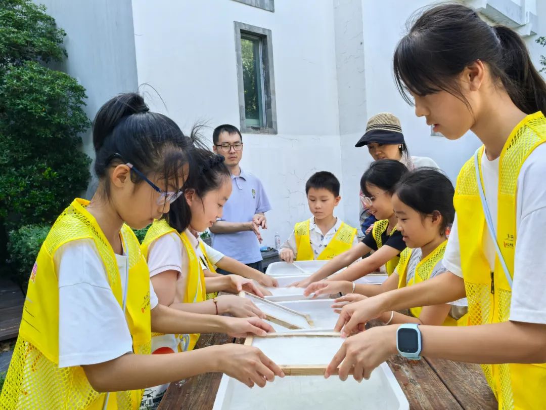 午后的“非遗工坊”里,孩子们围在老师身旁,认真学习“徽州古法造纸技艺”。纸浆、抄纸帘、水桶、模具……这些看似寻常的材料工具,在小手中变成了造纸的“法宝”。在工作人员的耐心指导下,大家有条不紊地完成搅拌纸浆、抄纸帘捞浆、挤压、晾晒等工序,亲手复刻这项流传千年的技艺。
